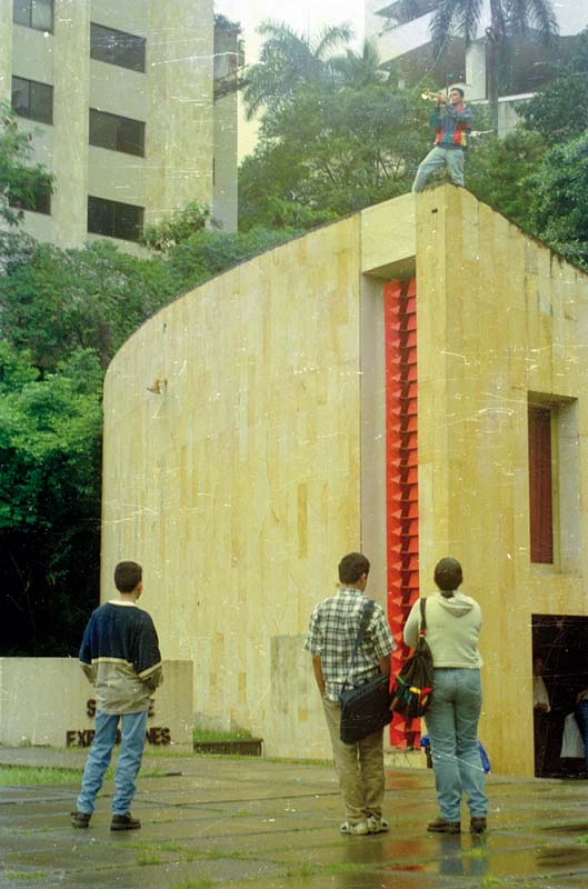 Abre el evento con explosiones de petardos al frente y en la parte de atrás del edificio en una especie de ceremonia grave y fúnebre. Un toque de Diana que duro un minuto, una persona vestida de blanco es quien llega con una corona de flores con el nombre del artista que estuvo ausente, colocándola frente al museo e inaugurando la jornada.