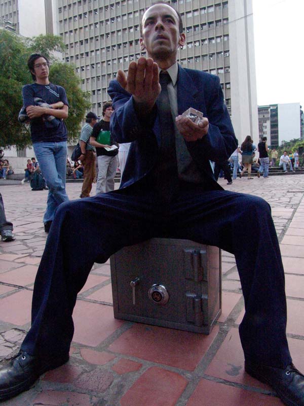 [Instalo una caja fuerte y desarrollo la acción de desplazarla arrastrándola por el piso, junto a ella se efectúa la acción de pedir dinero a modo de limosna tal y como lo hacen los seres desplazados, pobres y marginales, así mismo se alterna con la acción ritual de magnetizar mi cuerpo y el de los transeúntes con un cubo transparente, objeto evocador de las medicinas alternativas o de santería, acción que hace referencia a la limpieza. En la caja fuerte se guarda como tesoro tanto el dinero recolectado como la energía tomada simbólicamente en el acto de depuración tanto de mi cuerpo como el de los otros.
