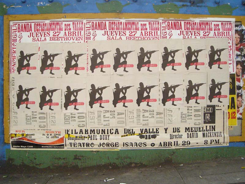aquí le enviamos unas fotos tomadas durante el incidente frente al consulado de Colombia en Londres,en el dia de hoy, hacia las tres de la tarde hora local mientras se realizaban las elecciones presidenciales colombianas. La policia arrestó a Paola Camacho, bajo cargos de la sección 5 del Public Order Act de 1986, por causar desorden en lugar público. Paola se encontraba frente al consulado como parte de un "flash mob", un accion espontanea de artistas que irrumpen en una situacion. En este caso, el artista Fernando Arias (www.fernandoarias.org) habia convocado a colombianos interesados para que se presentaran vistiendo una camisata y portando pancartas con una imagen controvertida diseñada él. La idea era iniciar un diálogo a partir de la imagen. De ahí que lleváramo cámaras de video para registrar y documentar las reacciones del público en un momento políticamente significativo. Aquí transcribo el texto de la invitación: "Esta es una invitacion para que se unan a mi campaña de Re-Erección. Solo tienen que venir al Consulado de Colombia este domingo 28 de Mayo, dia de las elecciones en Colombia, nos ponemos unas camisetas (ver foto) y colocaremos algunos afiches y nos paramos en la puerta a nada. Solo hay 10 camisetas asi que confirmen si pueden venir. (las otras camisetas las repartimos en el Festival de Performance de Cali). Asi no vayan a votar, vengan! e inviten amigos (manden este email a mas personas). Como remuneracion se quedan con las camisetas los primeros que lleguen!!!. y se llevan los afiches! uhhh! Por ahi a las 2pm, no mas tarde, la votacion se termina a las 4. Luego nos tomamos un drink por ahi."
