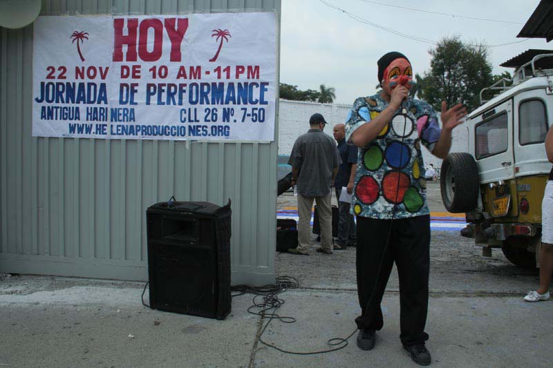 Como práctica usual en los países latinoamericanos gente vestida de payaso trabaja promocionando el acceso a restaurantes y a diferentes lugares. Omar Puebla del Ecuador apropiándose de sus colegas anuncia los diferentes trabajos que presenta el evento y “promociona” el evento mismo. Irónicamente el sector de la harinera está habitado por muchos indigentes.