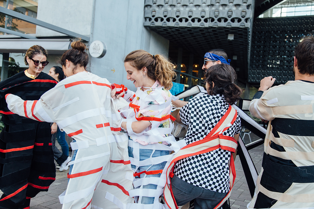 Clúster es un proyecto que parte de la premisa de crear una escultura interactiva sonora y consiste en parejas de trajes elaborados con velcro y tela. Los trajes están a disposición del público para que, una vez se hayan puesto uno de los trajes, puedan interactuar con otras personas. El proyecto se inspira en la moda y en la danza tipo contact en la que los bailarines –en este caso miembros del público–, se pegan y se despegan generando dinámicas de acercamiento, tensión y despegue a la vez que generan frecuencias sonoras inesperadas.