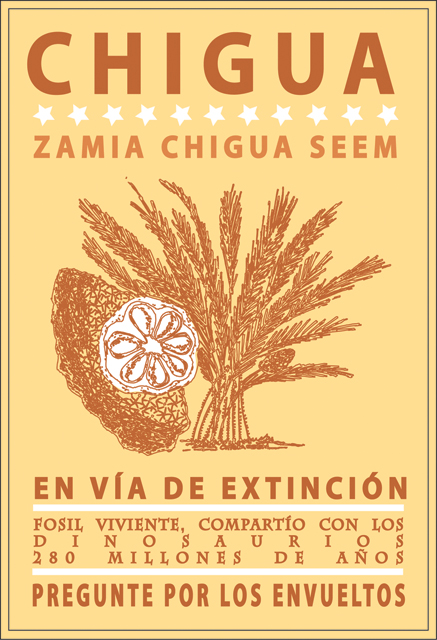 En este trabajo la coartada fue la chigua, una planta sobreviviente de épocas remotas, considerada fósil viviente, evolución de los antiguos helechos con semilla del paleozoico tardío, una especie protegida por organismos internacionales por hacer parte de la flora en vía de extinción. Prospera en el Pacífico colombiano. Con su fruto los nativos preparaban un envuelto de calidades proteínicas muy altas; la tradición de preparación de este envuelto se perdió dos generaciones atrás. Esta planta presenta un tallo supremamente espinoso, cuna de la serpiente X, y cuyo fruto venenoso sugiere que la condición de prueba y error a la cual tuvieron que someterse nuestros nativos para hacer comestible este fruto, para la consecución de esta fórmula, y recetas es notable.